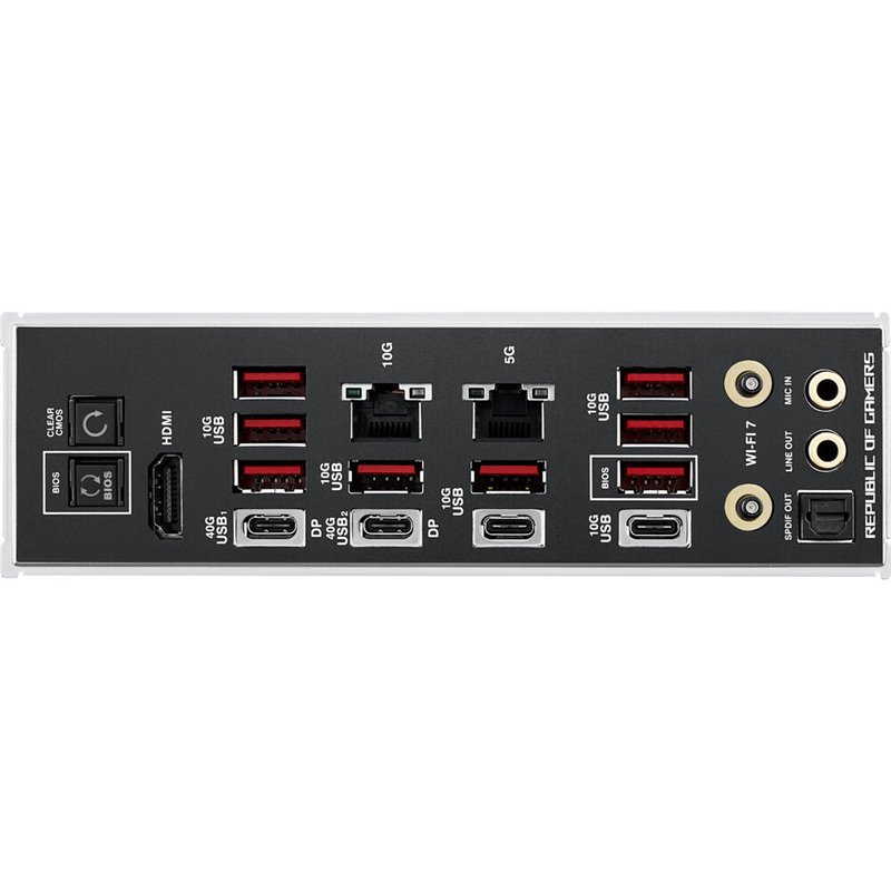 1x HDMI 2.1 (iGPU), 2x USB4 with DisplayPort 1.4a (40Gb/s, PD-Out 15W, iGPU), 2x USB-C 3.1 (10Gb/s), 8x USB-A 3.1 (10Gb/s), 1x toslink S/PDIF Out (Realtek ALC4082), 2x 3.5mm jack (Realtek ALC4082, illuminated), 1x RJ-45 (5GBase-T, Realtek), 1x RJ-45 (10GBase-T, Marvell), 2x antenna connector Quick Connect